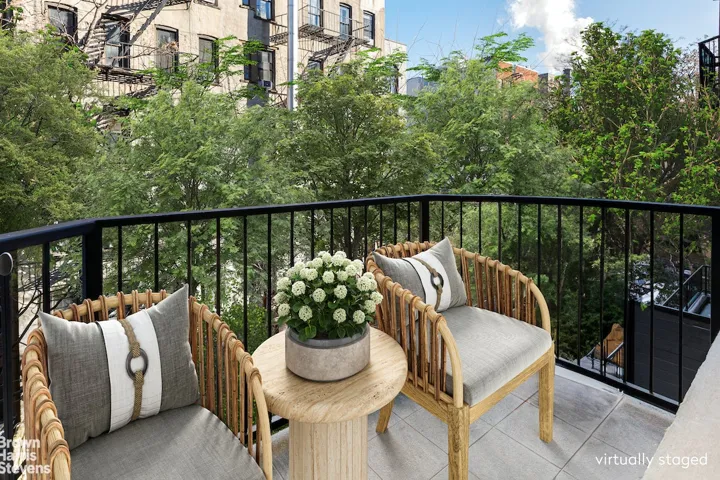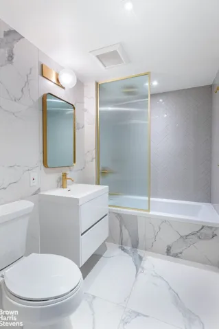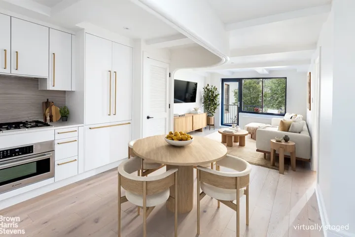– Open chef’s kitchen replete with brass hardware, marble backsplash and Bosch Appliances including a stacked washer/dryer in a dedicated laundry closet