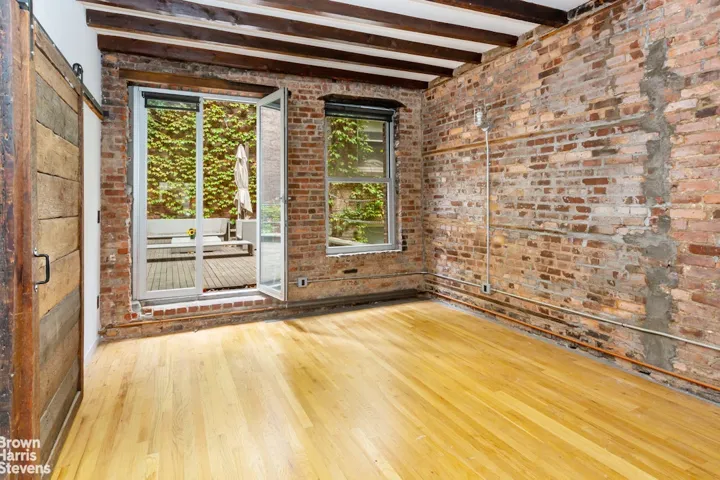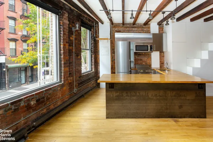 The living room features 11 foot beamed ceilings, exposed brick walls and giant, south facing windows. An open kitchen is decked out with stainless steel cabinetry, wrap around counter with room for seating, and state -of-the-art appliances like a Liebherr fridge, Verona stove, and Miele dishwasher.