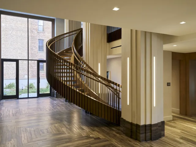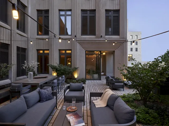 Vandewater’s interior design speaks to an old school design approach and showcases the beauty of the materials in a new and thoughtful way – oversized, high performance casement windows, tall ceilings, and European white oak floors. Elegant kitchens offer honed Perla Venata kitchen counters, chef caliber Miele appliances and custom, craftsman inspired oak cabinetry with pewter hardware. Primary bathrooms are outfitted with honed Windsor Cream marble, soaking tub, large shower with frameless glass enclosure, pewter fixtures, and custom oak and travertine vanities. All homes have the latest hvac technology from Climatemaster, laundry equipment from Whirlpool or GE, and recessed LED lighting. All residences have remarkable light, garden views and dramatic city vistas from the top third of the building. Preserved views in every direction allow for virtually no obstructions past the 20th floor, providing views of the George Washington Bridge, Hudson River, Central Park, downtown Manhattan and beyond. Select residences have outdoor terraces.