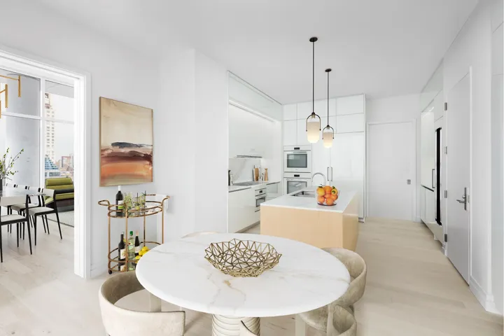 The 33rd and 34th floors are directly accessed through private elevator entry and showcase exquisitely designed interiors by CetraRuddy, featuring 14″ ceilings and surrounding glass walls revealing panoramic views overlooking Central Park, East River, and iconic New York City cityscapes throughout. Each floor is wrapped in a deep, continuous 1,186 square-foot private terrace that extends living and entertainment spaces into the skyline. On the upper 34thfloor, a gracious gallery leads to a luminous corner great room with substantial living and dining areas with sweeping north-, south-, and west-facing exposures overlooking the Manhattan skyline. A connecting library and wet bar add serenity and comfort. Adjacent to the great room is a separate, windowed eat-in kitchen with Italian white glass and aluminum trim cabinetry by Aran Cucine, book matched honed Calacatta marble slab countertops, a natural white oak island and full-height backsplashes, and top-of-the-line integrated Miele white glass appliances including a wine refrigerator. Completing the floor is a north- and east-facing guest bedroom with direct terrace access, ensuite bathroom, and walk-in-closet.