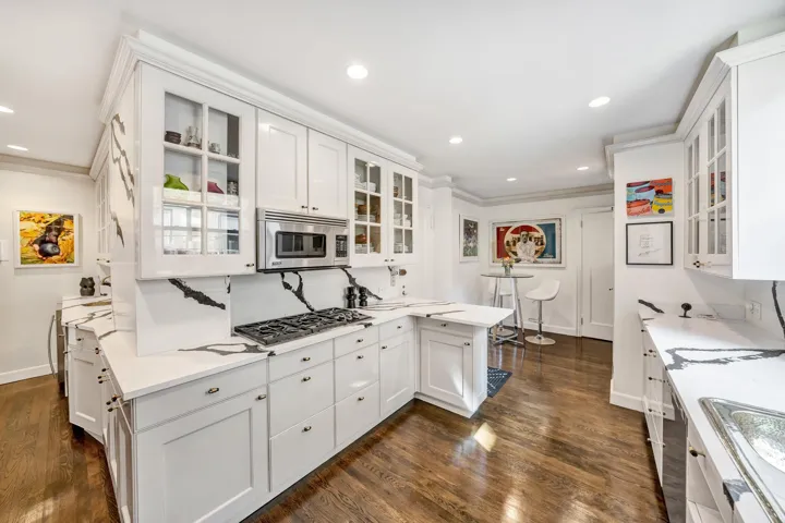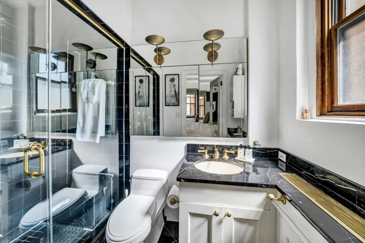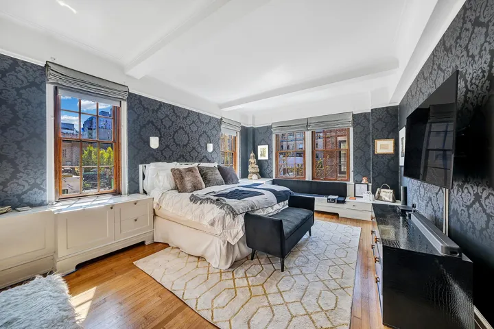 The two king-sized bedrooms with en-suite windowed baths are located in a private separate wing of the home. A tranquil, corner primary bedroom with West and South tree lined exposures, is a lovely, quiet oasis which exudes a European type of ambiance. It has four oversize windows, three custom closets, thoughtfully located built-ins, and a charming window seat overlooking townhouse gardens below. A corridor lined with built-in closets leads to the secondary king-sized bedroom suite, which has a walk-in closet and windowed full bath.