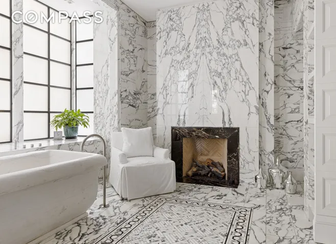 The third floor is dedicated to the Primary Suite. The oversized bedroom has its own balcony and fireplace. The bathroom is truly exceptional with floor to ceiling custom marble mosaic tile, a soaking tub, a fireplace, and Lefroy Brooks and Waterworks fixtures. Additionally, the floor houses multiple custom walk-in closets.