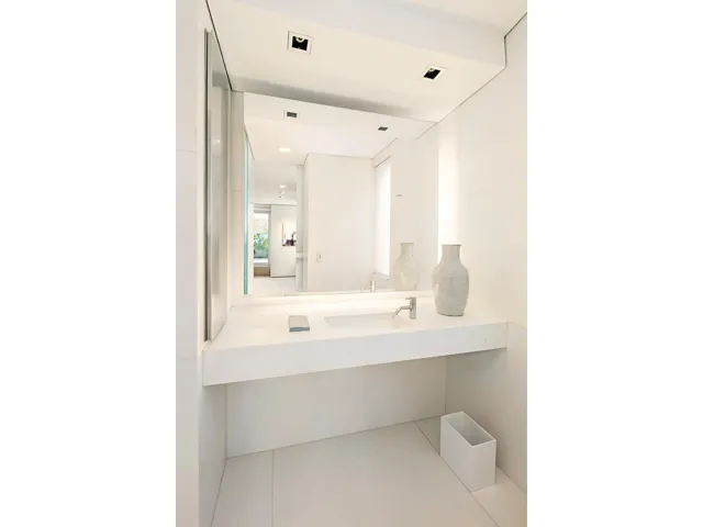 With four exposures, the glamorous, sun-flooded rooms of this apartment are presented as a serene horizontal spatial field defined by French plaster walls and ceilings, and a continuous, honed limestone floor. The living spaces are treated as connecting, open courtyards articulated by striking volumes of ribbon mahogany.