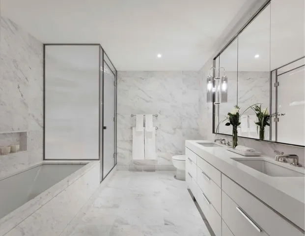 The primary bedroom features an expansive walk-in closet and a thoughtfully appointed ensuite bathroom with Venus White marble tile floors and walls, millwork vanity clad in a leathered textile, custom designed medicine cabinets and wall sconces, and polished nickel fixtures by Waterworks.