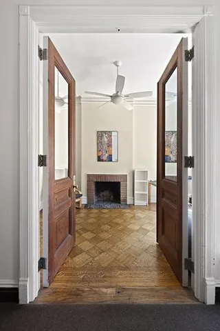 The townhouse’s third floor has another unit. This one-bedroom apartment has a wide front living room with high ceilings, a decorative hearth, and multiple windows with original shutters. A fully equipped galley kitchen links the front and back of the floor. Storage space abounds in this unit with two walk-in closets and a set of built-in pantry drawers. The bedroom boasts an ensuite bathroom and a terrific garden view.