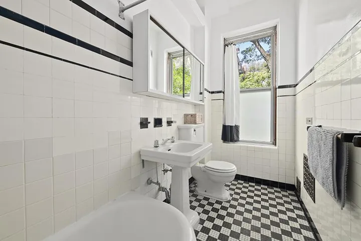 The parlour floor apartment is a one-bedroom delight. Highlights include large windows in both main rooms, high ceilings with original moldings, parquet floors, and two decorative hearths. A pocket door separates the front and rear rooms. The efficiency kitchen overlooks the townhouse garden, and the adjacent bathroom has a full-sized bathtub and shower.