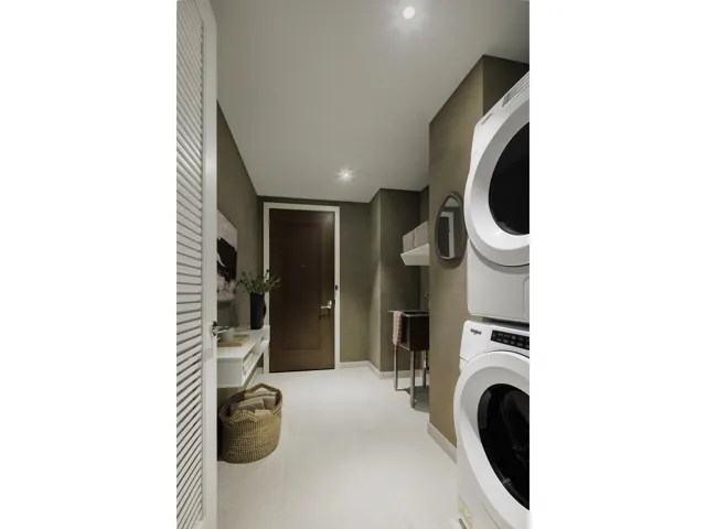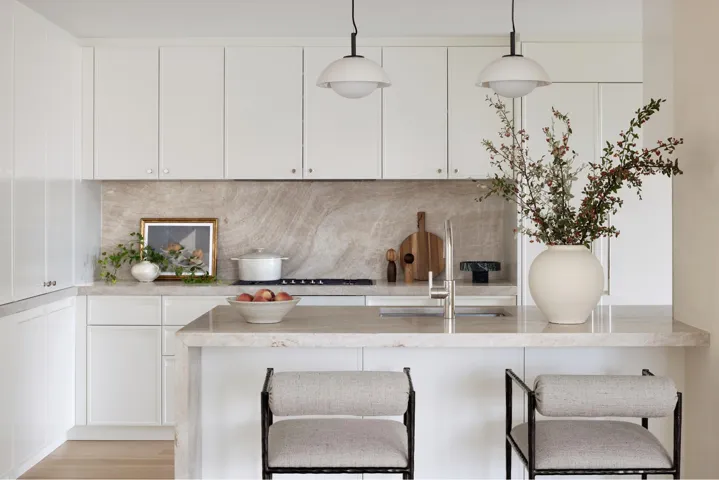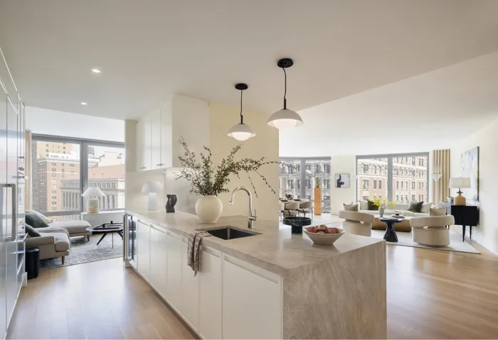 The open style kitchen is outfitted with white matte lacquer cabinetry, honed quartzite slab countertop and backsplash, including an island with comfortable seating and is fully equipped with a suite of Miele appliances including a double dishwasher, Sub-Zero wine storage, and a full-height pantry.