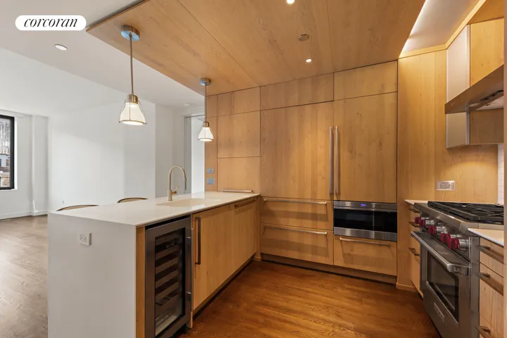 With special attention to sustainable practices and Green initiatives, this split two-bedroom, two-bathroom home offers southern exposures from every room, open kitchen with natural oak decor featuring a Corian breakfast bar, Sub-Zero refrigerator, a Wolf gas range, Bosch dishwasher plus a Sub-Zero wine refrigerator, garbage disposal and self-closing drawers.