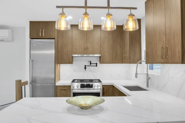 Featuring Contempory Open Concept Chef’s Kitchen with 6 Burner Stailess Stove and Pot filler. Calacatta Gold Counters and Backsplash W/ Huge waterfall Breakfast Bar.