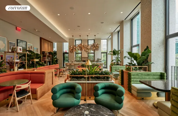 Residences at The Bryant, located at 16 West 40th Street, sit atop a boutique hotel and amenities include a 24-hour attended lobby, lounge, fitness center with sauna, and access to the Branch Club with fireplace and full bar overlooking Bryant Park.