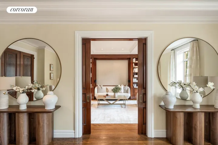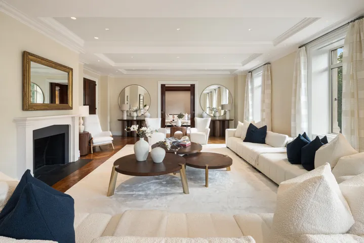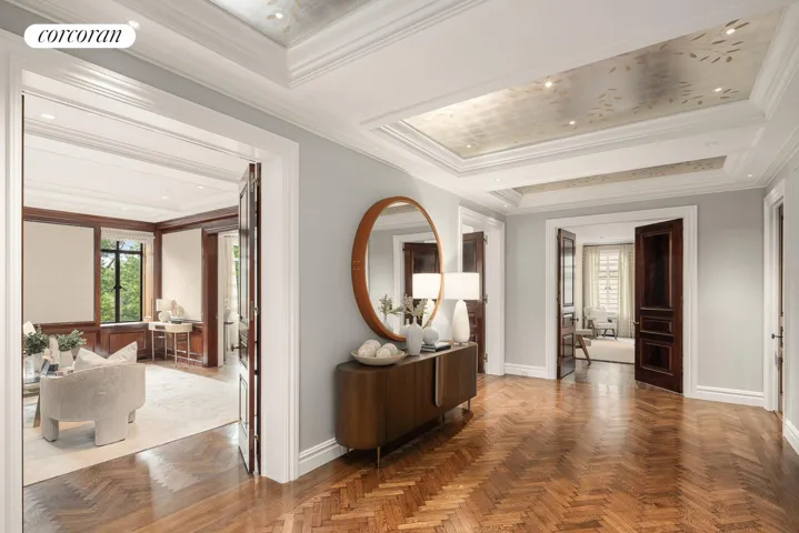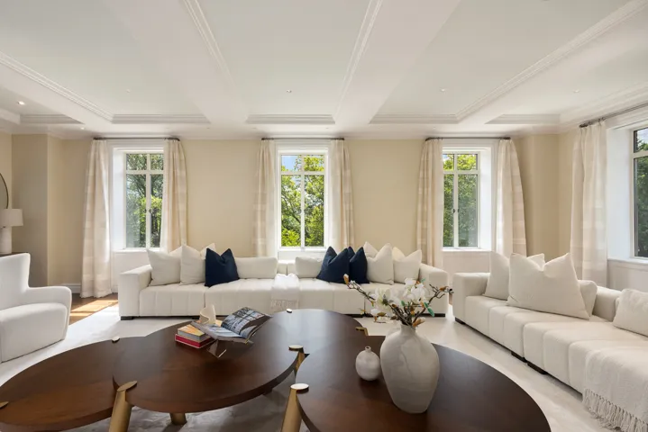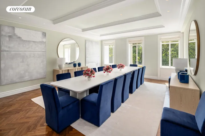 Off a private elevator landing, one enters into the entrance foyer as well as a 20’10” long gallery, from which beautiful Central Park views are framed through oversized casement windows. The regal formal dining room is 22’5″ long and has a set of French Doors leading to a Juliette balcony overlooking Central Park, providing the ideal vantage point for the Thanksgiving Day Parade. Adjacent is the handsome library which is finished in mahogany, and has pocket doors to the living room. In the corner is the palatial living room with dimensions measuring 30’8″ long by 20’2″ wide; it has both eastern views towards Central Park and southern views of the iconic Manhattan skyline. This room is luxury defined.