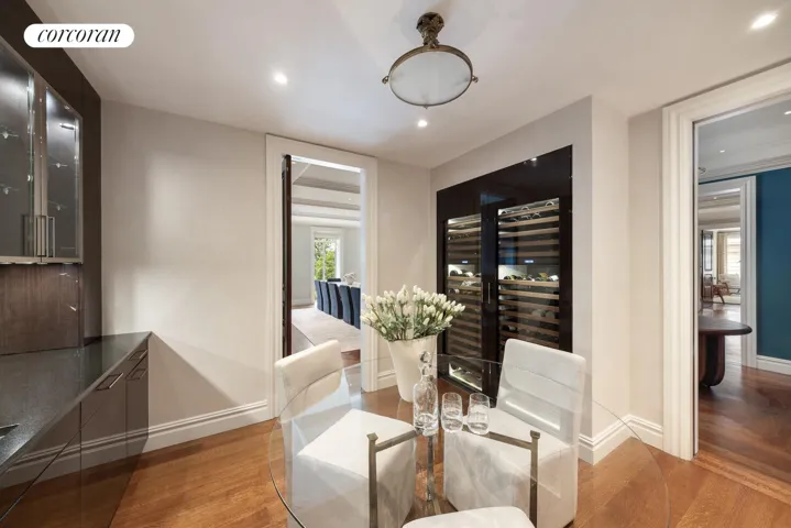 There is an enormous windowed eat-in kitchen that has a center island with seating as well as a large breakfast area that can accommodate a table that seats six. The kitchen has custom cabinetry and is equipped with Miele, Subzero and Wolf appliances. Connecting the kitchen to the dining room is an incredible butler’s pantry with two Subzero wine refrigerators, a second sink and excellent storage providing for endless entertaining. Off the kitchen is a laundry room with a side-by-side washer/dryer and a sink as well as a staff room with its own bathroom. Completing the public spaces are two large coat closets and an elegant powder room off the gallery.
