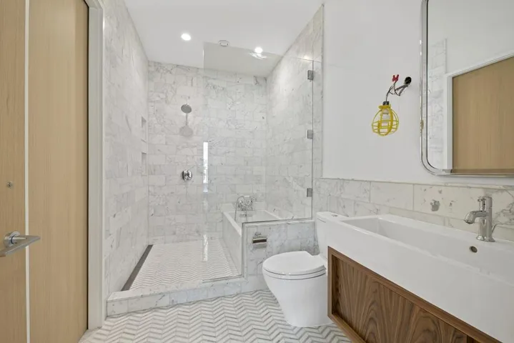 Two bedrooms occupy this level, which could also be purposed as offices, studios, or dens. The front room has a wet bar, while the rear room leads out to a gorgeous private roof deck. Each room has its own closet and white oak floors. The two rooms share a Statuary marble full bath.