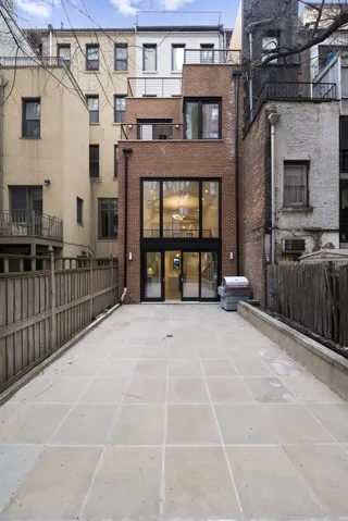 Enter a grand living room with eleven-foot ceilings from a newly restored, historically accurate stoop, and enjoy the dramatic open sightline to the rear of the townhouse. In the rear, you’ll find a light-filled dining room featuring a large custom chandelier and its own open staircase down to the kitchen. The floor-to-ceiling windows that cover the back wall afford generous sunlight and beautiful garden views.