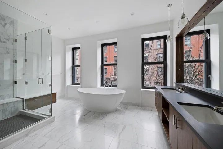 This entire floor is devoted to the primary suite. An enormous Bianco Carrara and Thassos marble primary bath with a soaking tub occupies the front of this level, separated from the bedroom by two adjoining walk-in closets. The grand primary bedroom features white oak floors, a wet bar, and a secluded reading nook in the back. French doors lead to your own private balcony overlooking the garden.