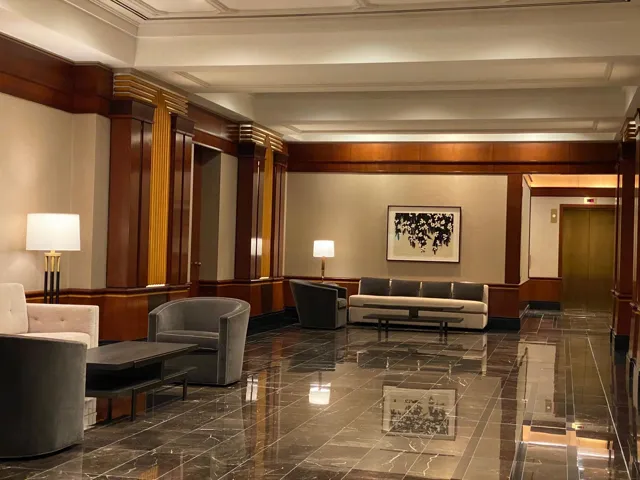 The primary bedroom continues the magnificence and splendor of the apartment by showcasing some incredible views North and East. There is architecturally designed custom cabinetry that is built in that is stunning. The closets have all been handcrafted by master craftsmen with no detail spared. The bathroom is spa-like and was completely re-designed with an extra-large shower and high-end floor to ceiling Porcelanosa Calcatta Satin Gold porcelain. The Shower Door was engineered, and hand made in Brooklyn NY by a local designer, and there are luxurious BRIZO + GROHE fixtures throughout. In addition, the owners have installed heated floors for that extra spa-like experience. There is also a half bath that is special and unique in its attention to detail with a floating sink and custom wall treatment.