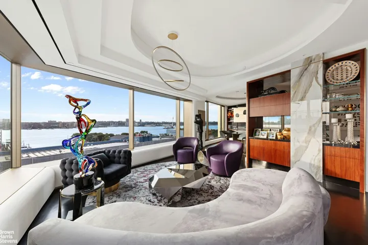 Experience New York living at its finest in the exquisitely chic Residence 7B, completely reimagined by renowned designer Pepe Calderin. This stunning, sun-filled convertible 3-bedroom, 2.5-bath home spans an impressive 2,425 sqft and boasts breathtaking views of the Hudson River and the Statue of Liberty, thanks to sweeping walls of glass that invite natural light to pour in.