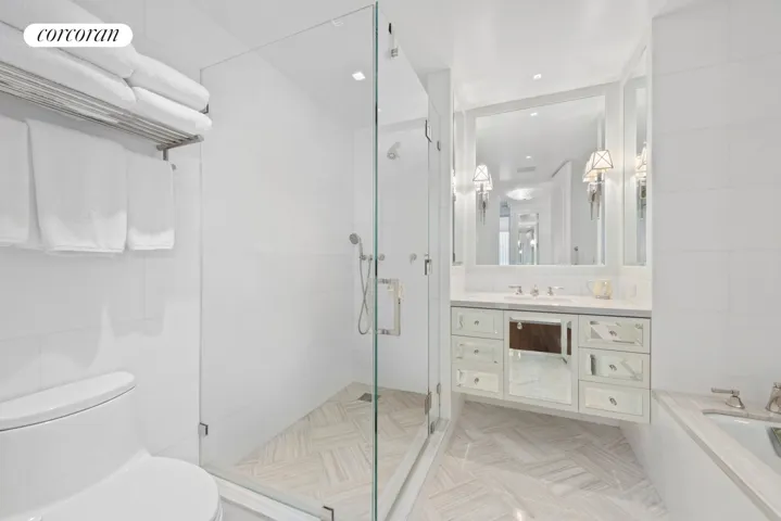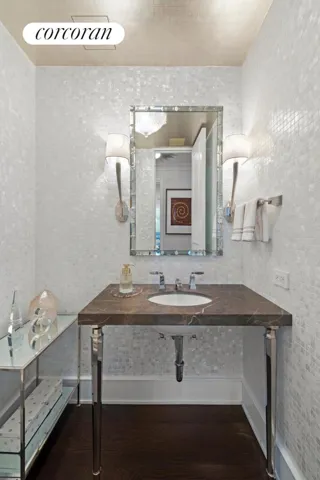 32D has a thoughtful floorplan with generous room proportions. There are two large bedrooms, both with ensuite bathrooms plus an additional, dreamy powder room with luminous pearl-like wall tiles. The spacious primary bedroom offers a dressing area with a beautiful mirrored vanity and Kallista sink in addition to the large spa-like bathroom with deep soaking tub, and separate shower. Also found in the primary bedroom is a large, convenient built-out home office. The expansive living area feels open and voluminous.