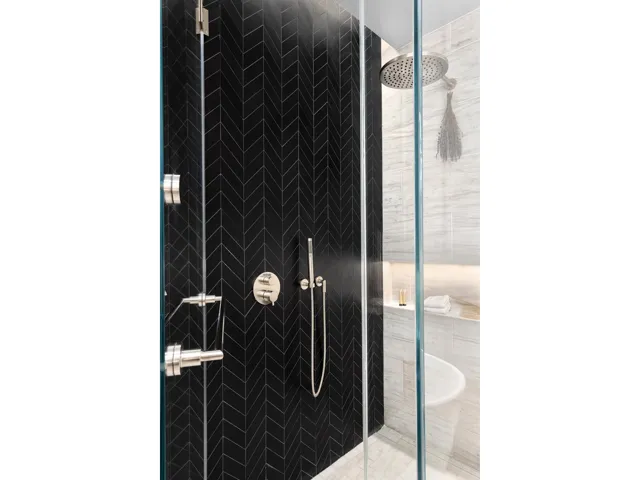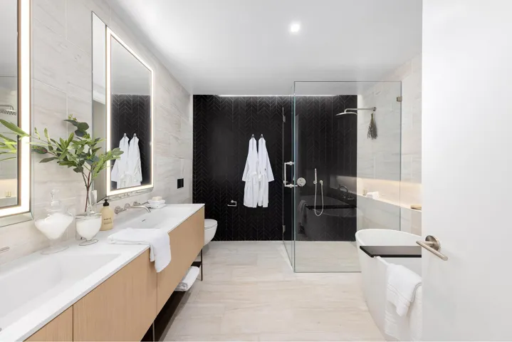 The primary bedroom showcases two exceptionally large bedroom closets as you make your way to the en-suite bathroom. A freestanding soaking tub with separate glass-enclosed shower, radiant heated floors, and stellar white honed marble floors with a chevron mosaic black porcelain accent wall, a custom mirrored medicine cabinet with surround lighting, a double white oak vanity with oil-rubbed bronze legs with lower open towel shelf, and Dornbracht platinum matte fittings throughout are featured in the primary bathroom. The secondary bedroom offers an adjacent bath with a Gioia Venato honed marble surrounded shower and staggered Woodgrain Silver honed marble walls. A laundry closet with Whirlpool washer and dryer completes the offering.