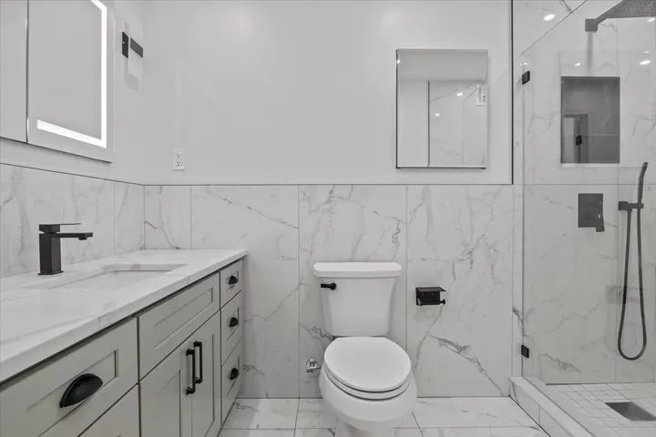 illuminated medicine cabinet surrounded by beautiful tile and matte black hardware. Ahead, the