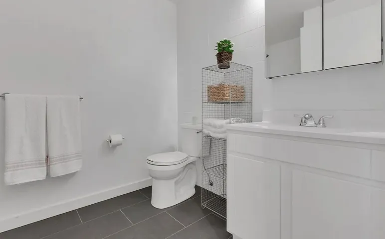 The apartment has an ideal open concept kitchen boasting sleek Quartz countertops, marble backsplash, high end stainless steel appliances, and gorgeous custom white cabinetry. With a massive bedroom, you have an optimal layout for maximum flexibility in how to arrange your home. A spacious bath with white cabinetry, beautiful handcrafted fixtures, and a lovely glass encased walk-in shower complete this phenomenal home.