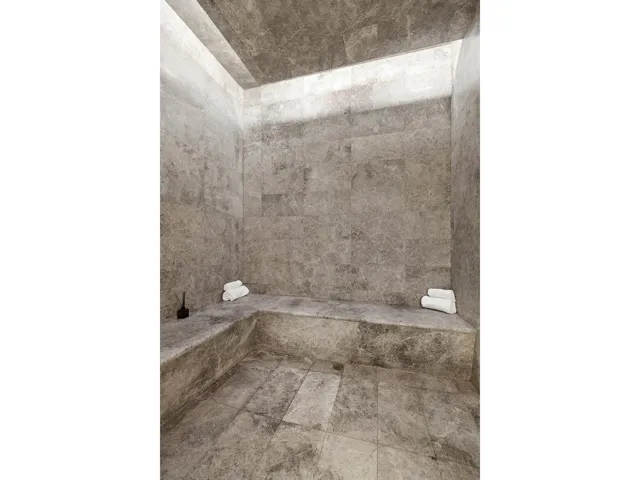 The primary suite is an oasis of tranquility, offering ample space and an impeccably designed, five-fixture bathroom. Heated radiant floors, a stunning honed Tundra Gray marble countertop, and bespoke lighting by Sheppard elevate the luxurious spa-like experience, creating a perfect retreat from the world.