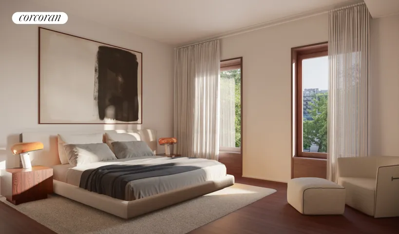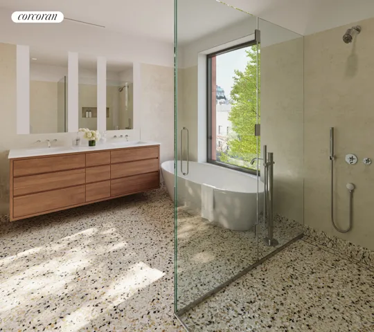 Located on the sixth floor, you will find five spacious bedroom suites defined by generous proportions, millwork closets, and large mahogany-framed windows creating a luxurious livable residence that is of a scale rarely available in prime SoHo. The primary suite is anchored by a dramatic corner window with views of the midtown skyline, which can be enjoyed from the suite’s sitting area. With the same impressive views, the primary bath is outfitted with a gracious double vanity a freestanding tub and a double shower, and is finished with natural airy tones of limestone and terrazzo. The bath is thoughtfully separated from the bedroom by a millwork-lined dressing room providing a world of functional storage space and supreme privacy. Adjacent to the primary suite, a large den would make an excellent family room, home office, bedroom, or could even be combined with the primary for an even larger suite if desired.