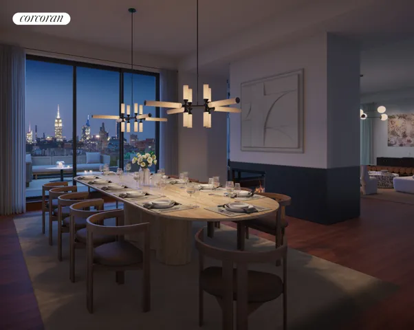The residence occupies the entire top two floors (floors six and seven) of this new boutique-scale condominium. The living and entertaining spaces are located on the upper level, where from the moment you enter the residence, you are greeted by panoramic views of the midtown skyline. The living room is encased in floor-to-ceiling windows looking out onto a 1,000+ Sq. Ft. wrap-around terrace. A double-sided gas fireplace separates the living room from the formal dinning room, and while these spaces were designed to welcome-in the views and natural light, they were also designed to include expansive wall plains to allow for installation of large format artwork or for displaying entire collections.