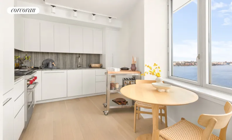 Enjoy Hudson River views and breathtaking sunsets through floor-to-ceiling windows from this sundrenched 1,594 sq. ft. northeast corner three-bedroom Penthouse residence. Interiors have been designed by the acclaimed, environmentally focused architecture firm COOKFOX, and feature 4 wide plank white oak flooring in a custom satin finish, and custom Italian kitchens with matte-lacquered millwork. Beautiful and durable Quartzite slab countertops frame fully integrated Sub-Zero and Cove appliances, a Wolf range, and stainless steel Julien sink with a polished nickel faucet. Bedrooms experience an abundance of natural lights and direct views of Teardrop park. Bathrooms feature Montpellier Limestone floors and Bianco Dolomite marble walls, counters and tub skirting. The custom millwork vanity is in a limed walnut finish and has an illuminated medicine cabinet with defogging mirror above. Additional residence conveniences include a Miele washer and dryer, oversized noise reducing casement style windows with a “low-e” coating, and a four-pipe heating and cooling system that allows for maximum comfort and year-round flexibility.