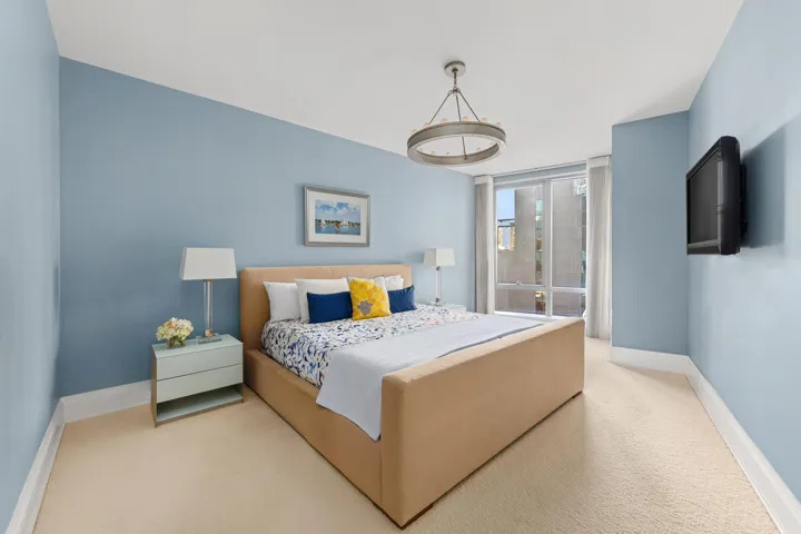 The split bedroom layout ensures privacy, with both bedrooms offering large walk-in closets designed by California closets. The primary bathroom exudes luxury with marble finishes, Dornbracht polished chrome fixtures, and a double-sink vanity. Enjoy a spa-like experience with a deep soaking tub and a glass-enclosed shower with a rainfall showerhead. The second bathroom offers a bright, elegant atmosphere with glossy white wall tiles and a white polished lacquer vanity.