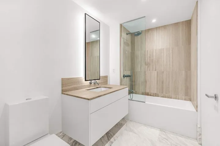 The apartment exudes luxury with elegant white oak flooring and custom millwork, providing a sense of sophistication and warmth. The kitchen is a standout feature, boasting Carrara marble countertops, custom cabinetry, and high-end Smeg appliances, combining beauty with functionality. Unit 503 also includes a washer and dryer, along with central AC and heating, ensuring comfort throughout all seasons. This 1064 +/- sq ft unit is more than a living space; it’s an embodiment of sophisticated urban living in the heart of South Williamsburg.