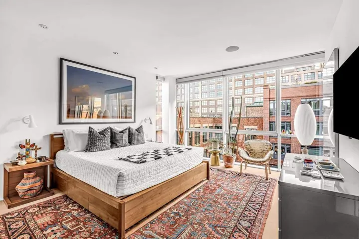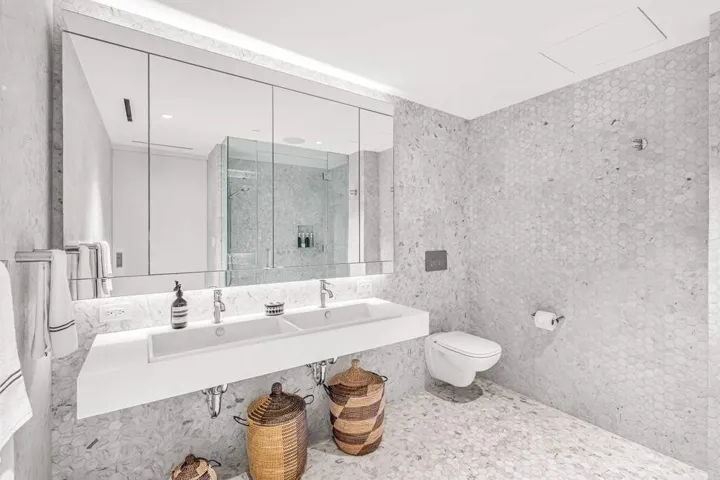 As you enter the generously sized primary suite, you’ll immediately appreciate the thoughtfully designed layout. This suite features a large custom fitted walk-in closet, Poulsen sconces on both sides of the bed, and a luxurious en suite bath. The en suite bath is highlighted by a glass shower enclosure with polished chrome Hansgrohe fixtures, hexagonal Blanco Carrara mosaic wall and floor tiles, a custom medicine cabinet with LED lighting, and a Duravit toilet. Also, on this level is the second bedroom, highlighted by custom closets, along with a conveniently located full bath, designed with the same high-end finishes as the primary bath.