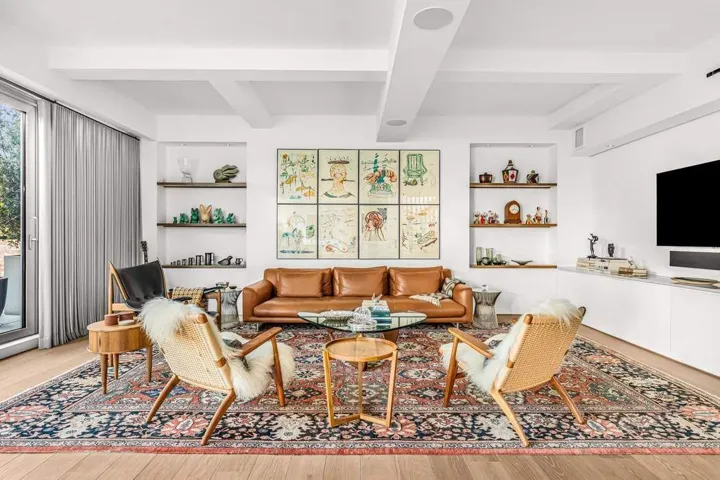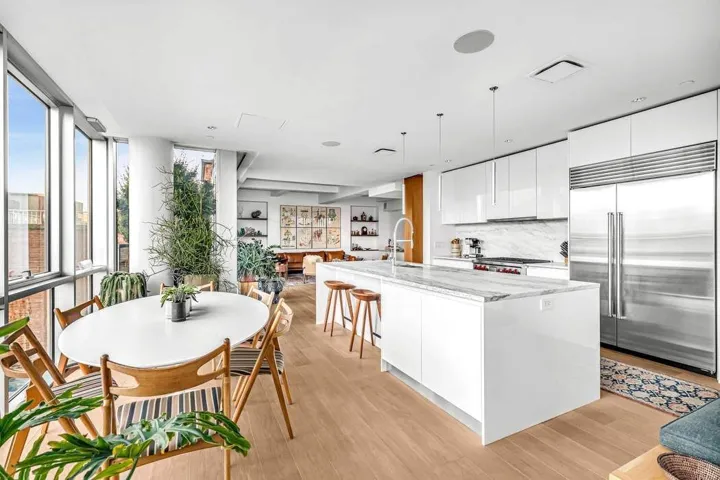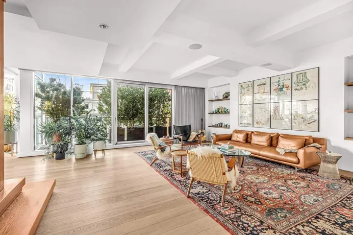 The well-designed living room features custom-built white oak shelving, recessed cove lighting, and marble-topped storage cabinetry. The living room seamlessly opens to the first private garden terrace, offering impressive views and serving as a perfect continuation of the space. The full scale of this open space is prefect for entertaining or everyday living. Enjoy your favorite movies and music with an integrated sound system installed throughout the apartment. Additionally, there is a full-length, floor-to-ceiling retractable drapery for added ambiance and privacy.
