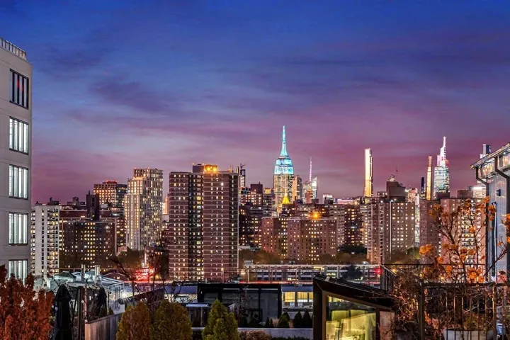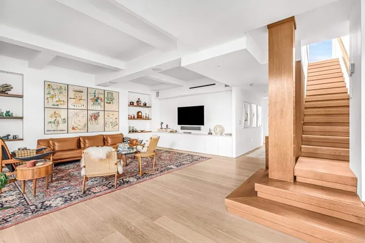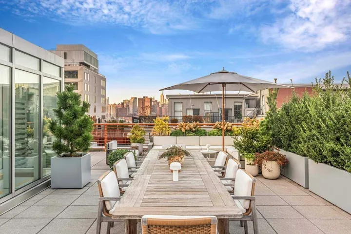 The architectural staircase leading up to the second level features a custom single-piece wood banister with recessed lighting and a Poulsen wall light. While upstairs, you will be struck by the incredible private rooftop terrace that wraps around two sides of the home, featuring a mature evergreen and hydrangea garden, a freestanding American Made grill, multiple unique seating areas, and breathtaking views that span across the Manhattan skyline. The gardens on both levels feature timed irrigation and lighting throughout. The sheer size and layout of the rooftop terrace can certainly cater to anyone’s needs whether it’s hosting a large gathering, an intimate dinner with a view, lounging on a sunny day, or enjoying beautiful sunsets.