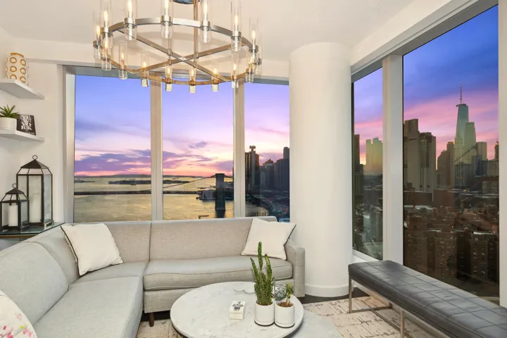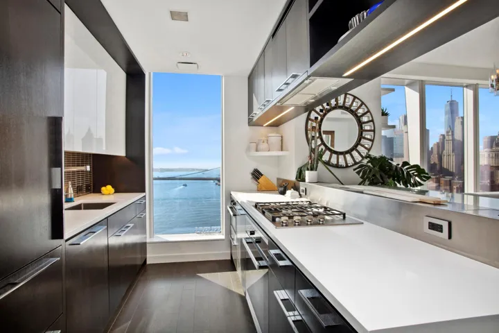 GREAT OPPORTUNITY FOR BUYERS AND INVESTORS! DROP-DEAD GORGEOUS VIEWS from every room of this stunning corner home! Floor-to-ceiling windows with breathtaking southern & western views of the East River, New York Harbor, Manhattan and Brooklyn bridges, Freedom Tower, & expansive city views of the NYC skyline, spanning uptown through Hudson Yards to the Empire State Building & beyond! Residence 27M is a beautifully appointed 2BR/2BA with an elegant open windowed kitchen, amazing water views, crisp white stone counters & rich wood cabinetry, and a sleek breakfast bar. Relax in bed gazing at the expansive water view from the primary BR with exquisite en-suite bath with custom vanity, frameless glass shower, marble walls, mosaic floors with radiant heat, & polished chrome faucets. Incredible city skyline western views from the 2nd BR capture dramatic sunsets. A full-size w/d is tucked away in a hallway closet.