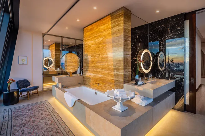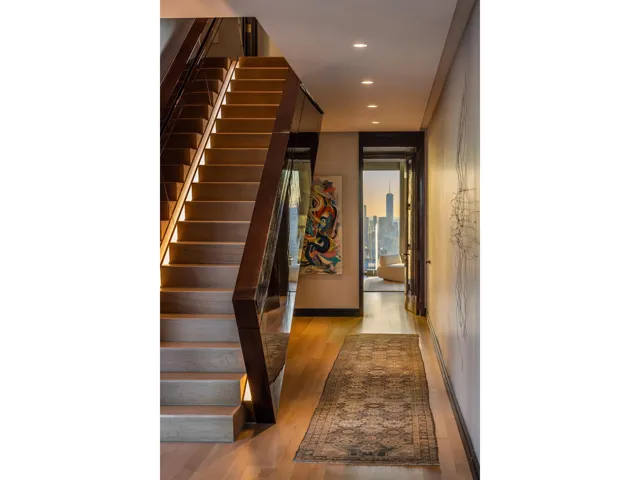 Accessible either via the dramatic interior staircase or the private interior elevator, the 79th floor is extraordinary. The primary suite offers panoramic views spanning north, south, and east; a large walk-in closet; and spa-like ensuite bathroom that blends tradition and originality. Elegantly appointed in polished Noir St. Laurent marble, high-honed Verona limestone, and polished Persian golden travertine with polished nickel Dornbracht fixtures throughout, the primary bathroom features two separate custom carved vanities, a cast iron Lefroy Brooks soaking tub, freestanding steam shower, radiant heated floors, private water closet with commode and bidet, and a linen closet. An additional bedroom on this level offers south- and west-facing views and a windowed en-suite bath clad in high-honed Verona limestone with polished nickel Dornbracht fixtures. No detail has been overlooked, from the custom interior lighting design by Thierry Despont in collaboration with Schwinghammer, to the motorized Lutron solar shades throughout with additional blackout shades in each bedroom, to the supply of humidified and filtered fresh air throughout the home.
