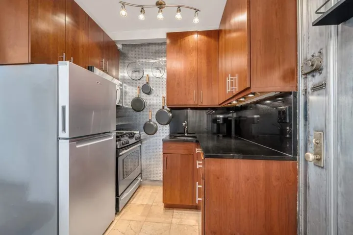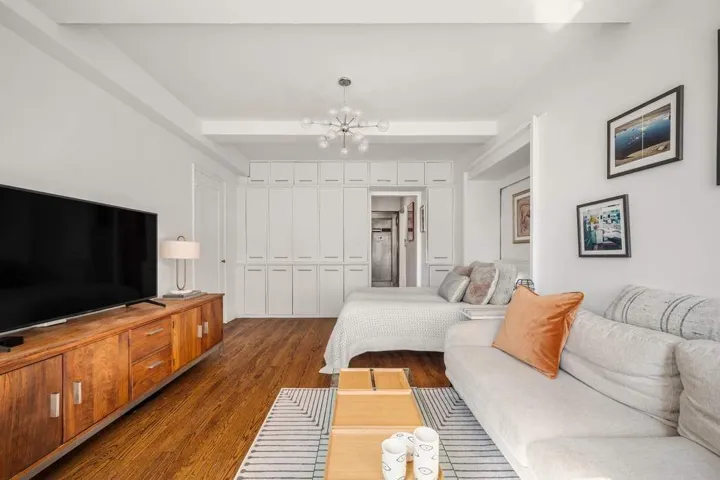 London Terrace Studio with hardwood floors and Eastern exposure with great light. This jewel has a renovated kitchen, stainless steel appliances, GE range & microwave, Miele dishwasher, granite kitchen counter with unique stainless steel storage wall, genuine wood cabinets, limestone kitchen floor, generous size closet, murphy bed, and in-wall A/C. Art deco bath with white subway tile and mosaic tile floors. Included in your monthly maintenance gas, heat, water and access to the Olympic size swimming pool, steam and sauna.