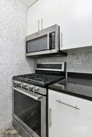 The king-sized primary bedroom includes a private balcony, four custom California closets, and a spa-like en-suite bathroom. The gourmet kitchen has been thoughtfully renovated, featuring a sleek satin off-white cabinetry palette and premium stainless steel appliances. The contemporary bathrooms complement the elegant design, offering a modern aesthetic.