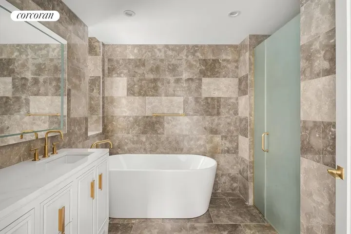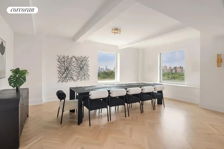 The oversized primary suite is a private sanctuary, offering sweeping Central Park views, a serene dressing/seating area, two custom walk-in closets, and a lavish en suite bathroom. This spa-like retreat features a soaking tub, a glass-enclosed shower, and double sinks. Two additional generously sized bedrooms, each with en suite bathrooms and ample closet space, are thoughtfully located in the south wing, ensuring privacy for the primary suite.