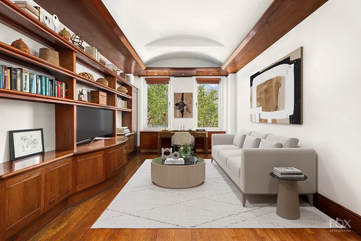 The charming library has a wet bar and marble powder room. The bedroom wing has an enormous primary bedroom and huge bath. Facing East, a sunny and spacious second bedroom also has an en-suite marble bath. The renovated eat-in kitchen has top-of-the-line appliances and a laundry room off the kitchen. A windowed staff room, located on the ground floor of the building, is included in the purchase.