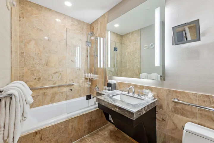 This newly decorated suite has floor-to-ceiling windows with iconic views of Broadway and the surrounding skylines. The perfect living and dining room combination enables one to relax or entertain in a charming space, while viewing the activity of Columbus Circle. The bathroom-lush with marble tiles, a sleek glass shower door is coupled with a marble vanity, making this modernized bathroom just ideal! A fully equipped kitchen with high-end stainless steel appliances offers an easy lifestyle with comfort. This pristine apartment is perfect for any user or investor.