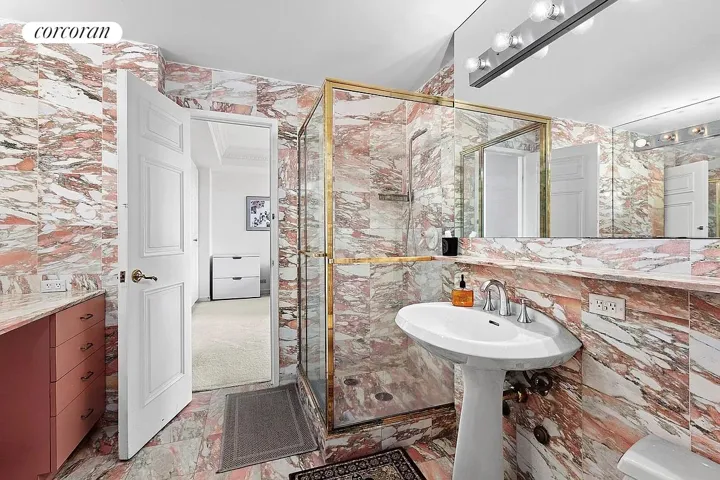 Two main bedrooms are king size, with incredible amount of closet space, custom crown moldings and two are having balcony access. Master Bedroom has on suite bath, is accented with granite tiles, and has double sinks, and natural light, while 2nd bedroom also has on suite bathroom with the shower and gorgeous brass and stone details.