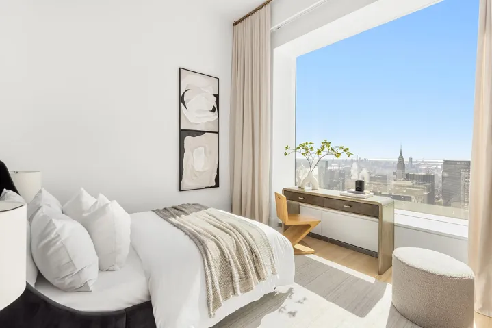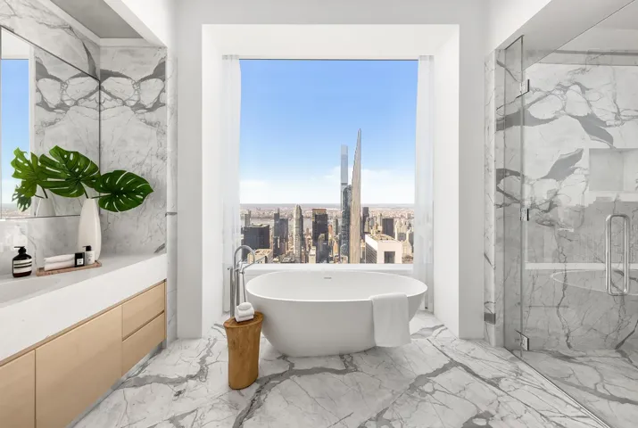 Occupying the entire western half of the 66th floor, this 4,019 square foot residence at the iconic 432 Park Avenue encapsulates fully unobstructed views of Central Park and the Manhattan skyline through its grand array of colossal, triple-paned 10 10 windows and 12.5′ ceilings. The attraction to the B line on this floor is what truly sets this residence apart from other units in the building. While clearing the GM building and all subsequent surrounding towers, 66B boasts eye level, panoramic Central Park views which are unmatched throughout the entirety of the building. After being whisked up the high-speed elevators, one is welcomed to a private gallery landing which leads directly into the main entrance of the residence. Upon arrival, the apartment speaks for itself. Greeted by incomparable corner views of Central Park highlighted with abundant sunshine, this residence exemplifies the pinnacle of luxury living on Billionaire’s row. The corner living and dining room of this residence is grand in size and boasts 12.5′ ceilings. Off the living area is a generous chef’s kitchen which features a built-in marble countertop overlooking Central Park. The kitchen is replete with Miele appliances including stove, gas cooktop, dishwasher, built-in coffee system, warming drawers, speed oven, dishwasher and wine storage. The magnificent master suite features two separate bathrooms and a walk-in-closet. Both master bathrooms are outfitted in Italian Statuario marble, heated floors, and boast soothing steam showers. One of the master bathrooms features a soaking tub with sunset views to the west overlooking the Hudson River and beyond. The master bedroom is positioned on the southwest corner of the building. The south facing, sun blasted windows from all of the bedrooms, frame a dramatic, unobstructed skyline view as far at the eye can see. The subsequent two bedrooms also each have sumptuous en-suite marble bathrooms. The residence comes full circle with the bedroom wing connecting to the foyer, powder bathroom and private laundry room.