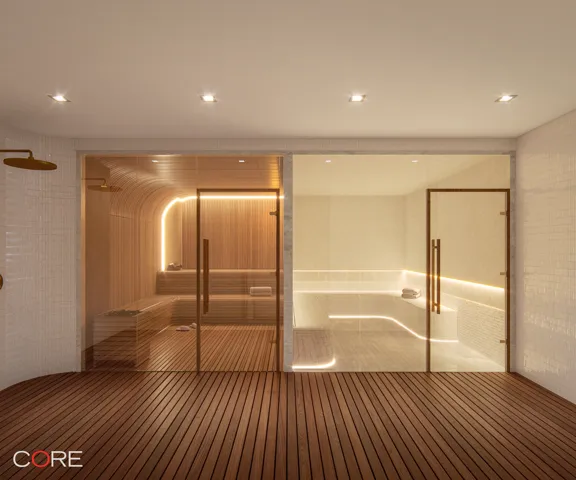 The double-height lobby welcomes you into a world of elegance, leading to the resident lounge and a beautifully landscaped courtyard with outdoor seating. Here, residents can socialize, relax, or entertain in style, both indoors and outdoors. Descend the spiral staircase to find the state-of-the-art fitness center with cardio machines, free weights, and a private yoga studio. The wellness spa is adjacent to the fitness center, complete with a steam room and sauna, featuring slip-free teak flooring, a cool-off shower, and towel service. Additionally, residents can enjoy a landscaped rooftop terrace equipped with barbecues, lounge chairs, and dining areas.