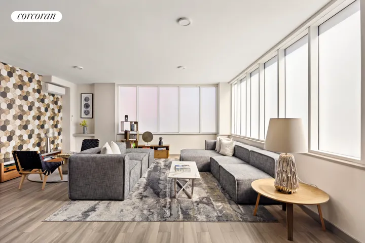 6C is a high floor, East-facing 1-bedroom with wide plank hardwood floors, central heating & cooling, and a balcony for private outdoor space. The unit entrance has a foyer well-sized for hanging art with a coat closet for storage. On the left is the bedroom with oversized windows, a double door closet, and room for a king-sized bed plus furniture. Straight ahead is the large living room and open kitchen with an island built for bar seating. The impeccably designed modern kitchen contains Frosty Carrina Caesarstone countertops & slab backsplash, custom cabinets by StyleLite, Hansgrohe fixtures, and a suite of Bosch appliances including a built-in microwave. The stylish, Spa-like bathroom comes well-appointed with Artwork tile, radiant heated floors, DuraVit soaking tub, KEUCO medicine cabinet and vanity for additional storage. Adjacent to the bathroom is a laundry closet with stacked Whirlpool washer & dryer and a separate linen closet. The building has a convenient, easy-to-use Virtual Doorman system and every unit comes with a deeded storage cage in the basement.