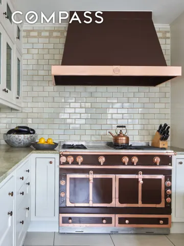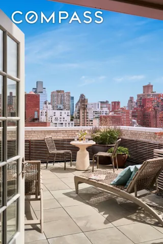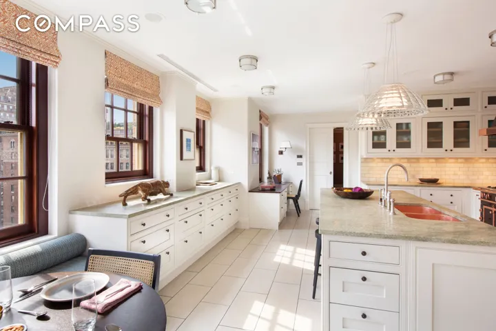 Locatеd withіn а full serviсe boutіquе pre-war condomіnium, thіs exceptional 12 room penthouse residence is uniquely complemented by 3 magnificent landscaped terraces. The private elevator landing leads to a gracious entrance gallery, a grand double sized living room (31’ x 16’) with soaring 10’ coffered ceilings, hardwood herringbone floors, and a limestone gas-burning fireplace, a stately formal dining room, a distinguished wood paneled library. The dazzling, sun flooded gourmet eat-in-chef’s kitchen is appointed with copious bespoke cabinetry detailed with elegant copper finishes, granite countertops, Ann Sacks tiled backsplash, 6 burner La Cornue gas range and hood, Subzero refrigerator, and 2 Bosch dishwashers is a chef’s dream come true! Nestled by the kitchen and separated by pocket doors the cheerful family room is ideal for casual gatherings. Also on this floor resides two large bedrooms each with ensuite (beautifully renovated) bathrooms, a charming children’s library/playroom, and all enjoy big blue skied open city views.