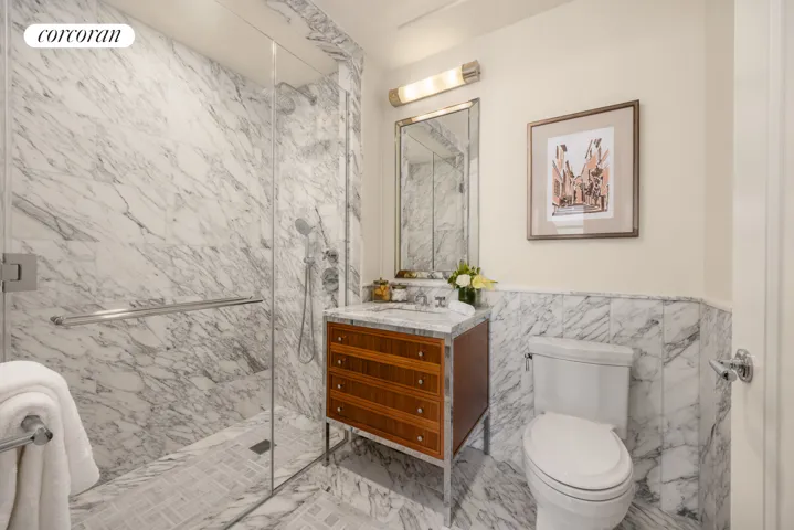 Primary baths are finished with Arabescato Cervaiole marble and feature marble mosaic tile flooring and custom sconces in polished chrome. Each primary bath includes a RAMSA-designed Italian walnut vanity with Arabescato Cervaiole marble countertop, polished chrome fixtures by Kallista, custom designed mirrored medicine cabinet by Robern, and water closet fixtures by Toto.