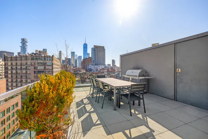 This level also includes a private entrance to the building’s amenity floor, granting direct access to the 24-hour fitness center, a bike room, and private storage, which comes deeded to the apartment. The building’s landscaped rooftop terrace is accessible via elevator and offers sweeping views of Downtown Manhattan and the Hudson River.