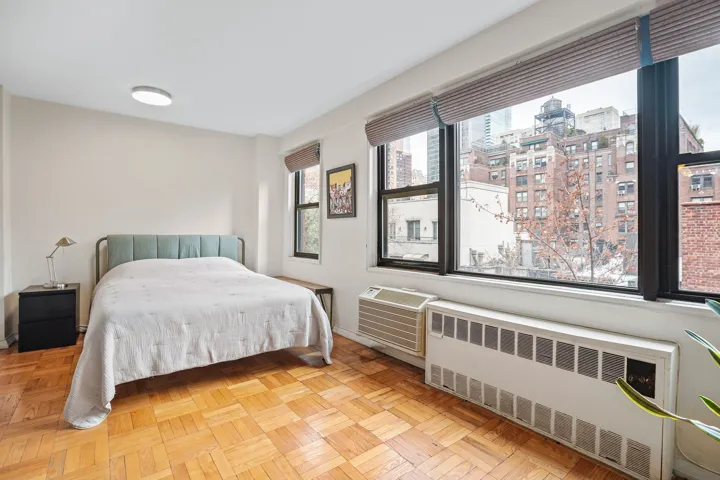 The kitchen, with its charming window opening into the alcove, promotes airflow and adds a sense of openness. Outfitted with a compact gas oven, dishwasher, and microwave, the kitchen balances practicality with space efficiency. Three well-sized closets offer abundant storage, while the classic parquet floors add warmth and timeless character.