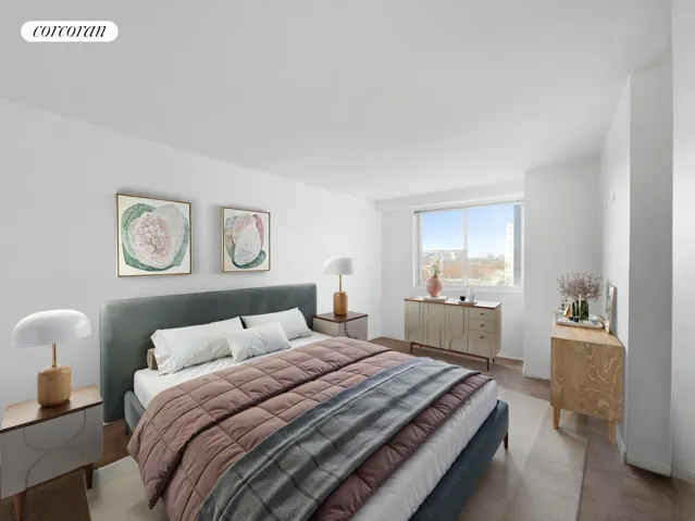 This bright and beautiful unit, situated away from the HHP, features a sun-drenched living and dining area with expansive west-facing windows overlooking the Hudson River and Palisades. The spacious kitchen offers ample room to work, while the original parquet floors-preserved under carpet for 50 years-have been recently restored to their natural beauty. Each room is equipped with individually controlled heating and air conditioning, positioned below large double-paned windows that frame breathtaking sunset views every evening. Generous closet space enhances both comfort and convenience.